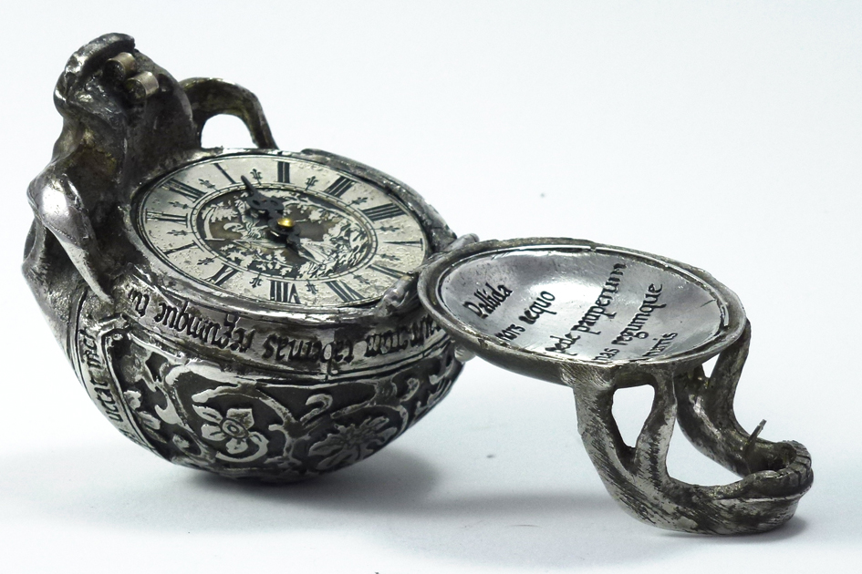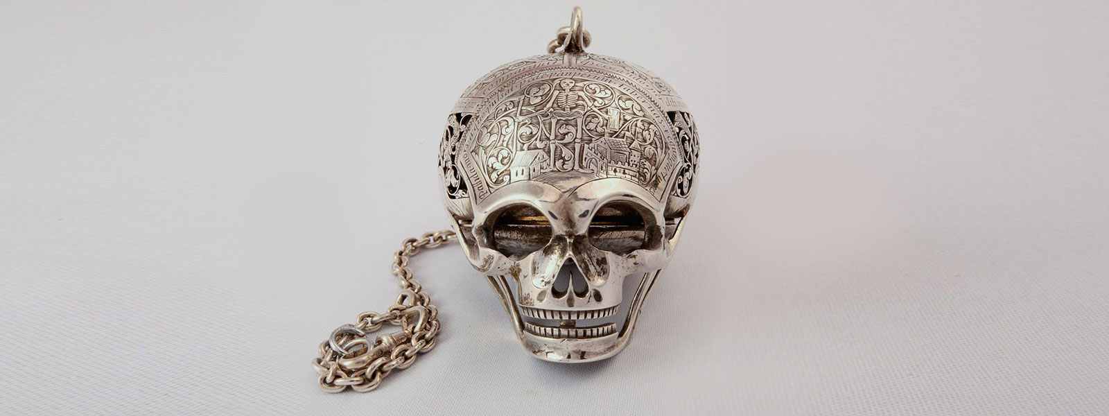 Watches were invented in the seventeenth century, and word as pendants, what we would call today “pocket watches.” In the 17th and 18th centuries, certain of these pocket watches were housed in a silver case that resembled a human skull. Yes, a skull.
