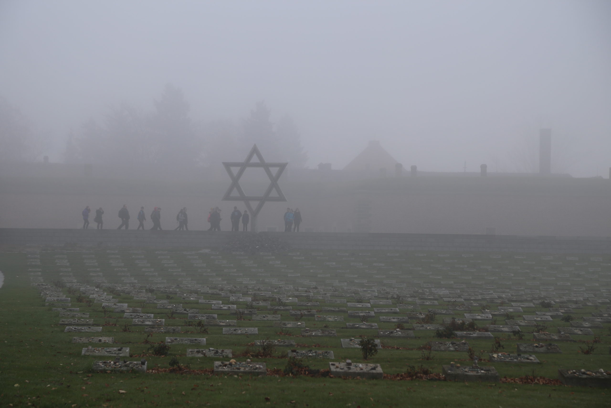 Terezin in morning fog. An eerie sight of the graveyard of prisoners next to the camp.